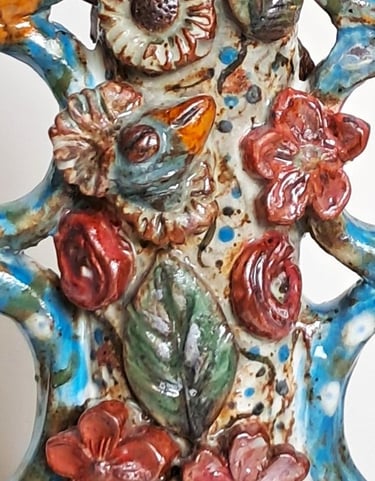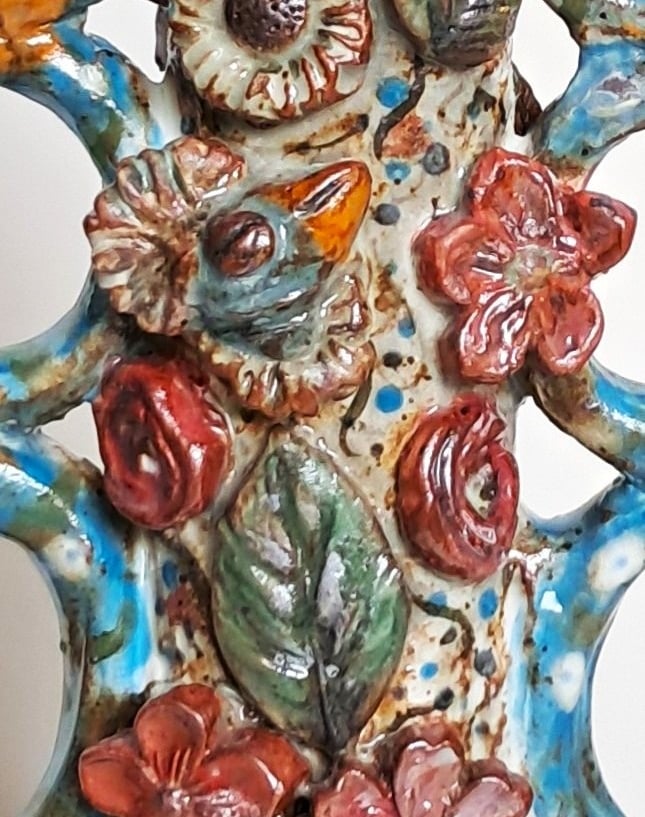 I spent decades living in Latin America, and I am humbled by the creativity of ancient and modern Mesoamerican artists. I work primarily in clay, fiber and oil paint, and my work is influenced by the popular arts of my native Mexico, where life as well as death are daily celebrations.
